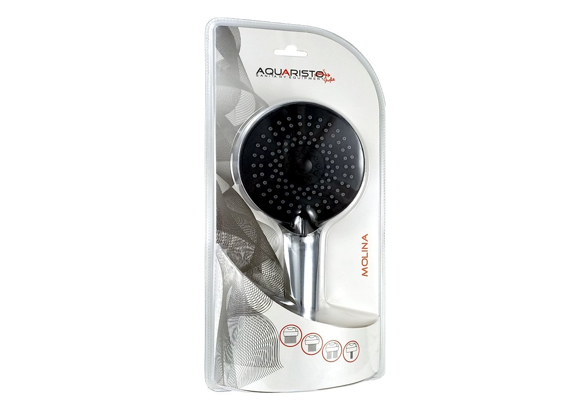 MOLINA, 4-polohová ruční sprcha, ø 110mm, chrom-černá matČtyřpolohová sprchová hlavice (sprcha) se vyznačuje designem umožňujícím libovolnou kombinaci s téměř veškerým příslušenstvím sprchového programu z naší nabídky – sprchové hadice , stěnové držáky sprchy , posuvné držáky sprchy (tyče ) případně stěnové vývody k bateriím pod omítku .Baleno v závěsném blistruSoubory ke staženíNávodRozměrový výkres Podrobný popis