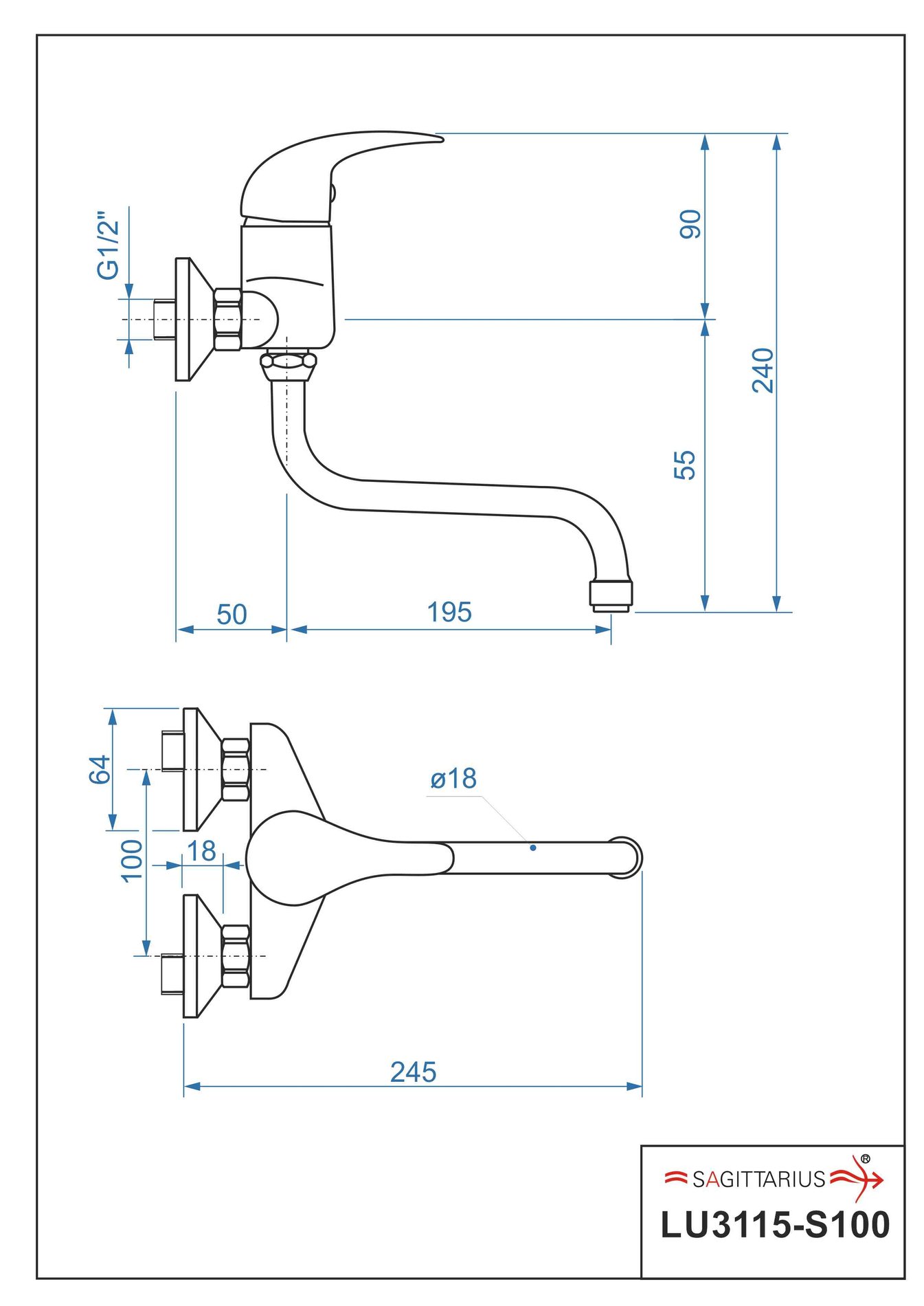Dřezová stěnová baterie LUNA s ramínkem „S“ (ramínko 200mm) – rozteč 100 mm
