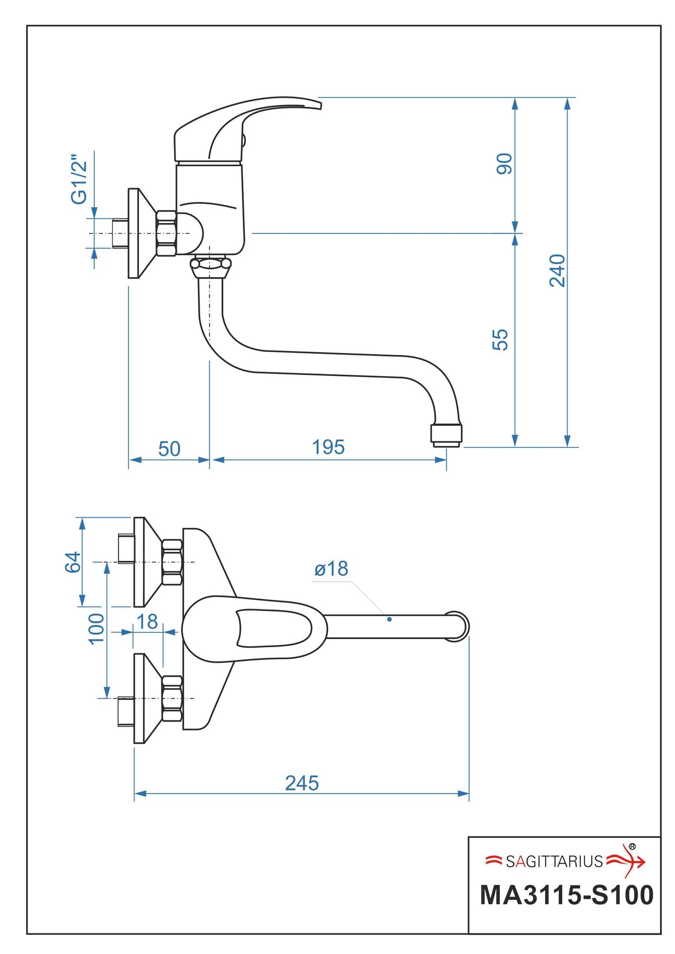 Dřezová stěnová baterie MARS s ramínkem „S“ – rozteč 100 mm