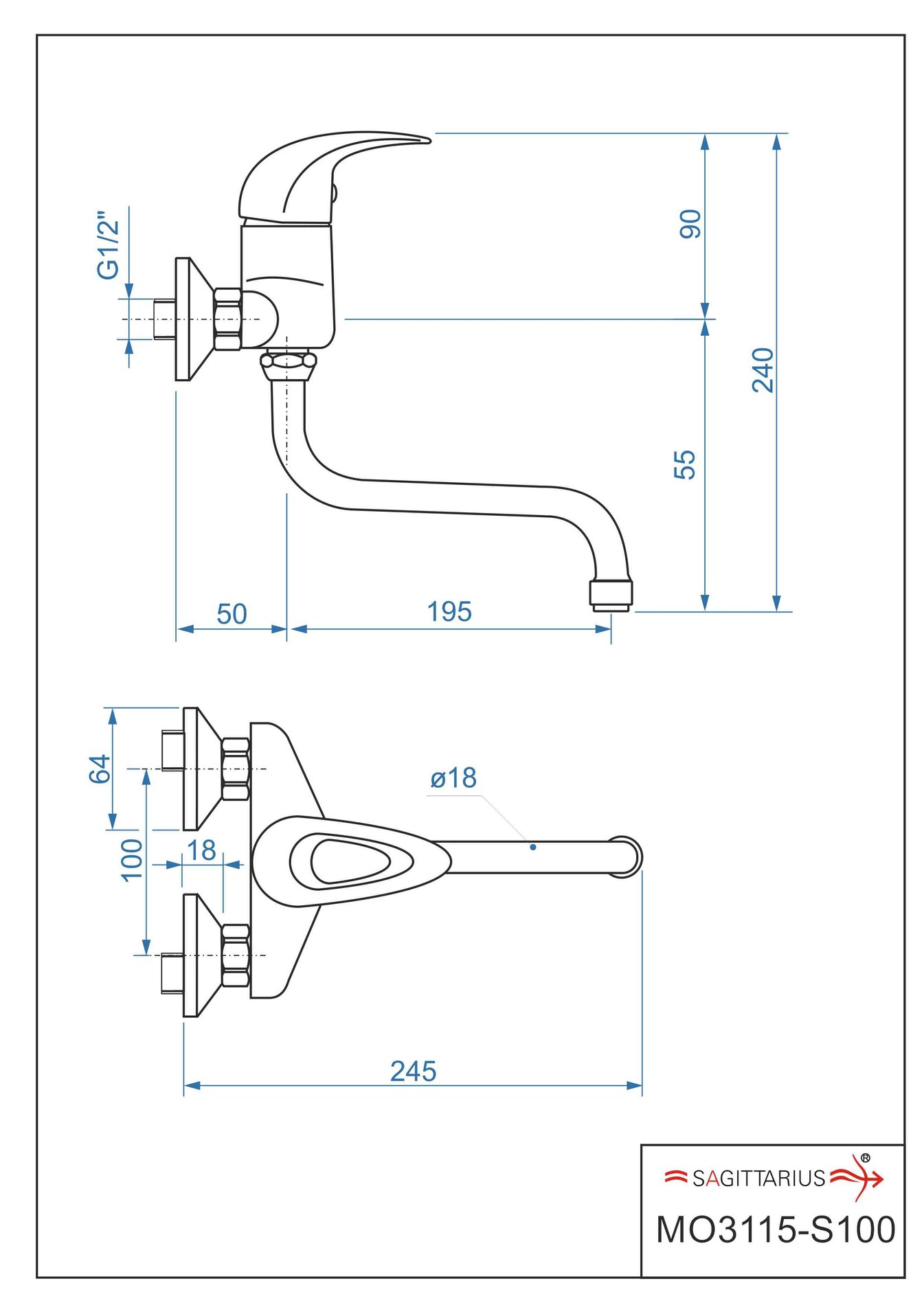 Dřezová stěnová baterie MOON s ramínkem „S“ – rozteč 100 mm