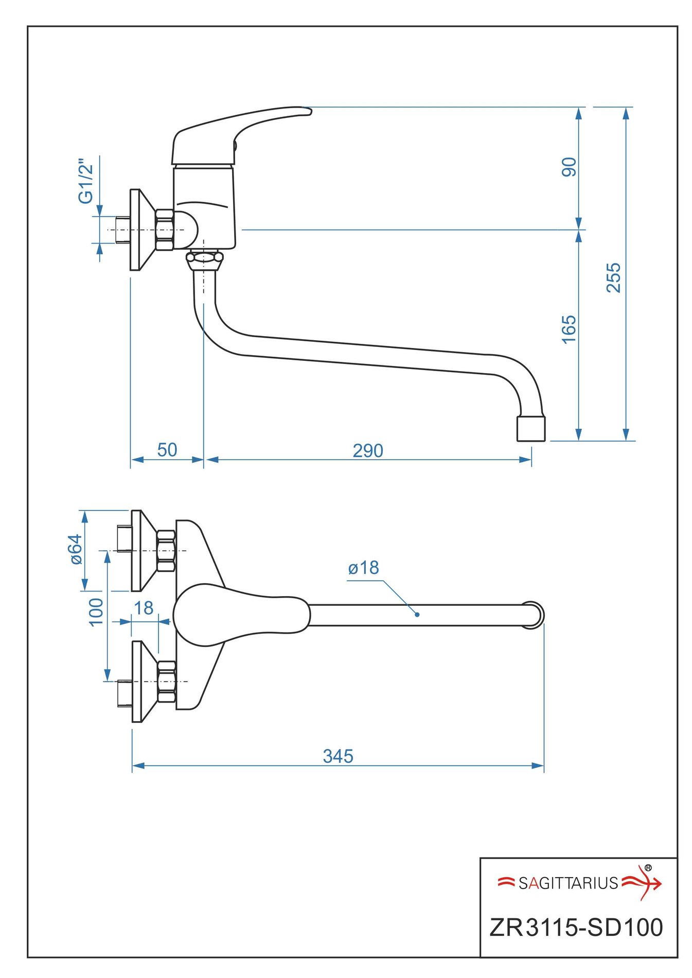 Dřezová stěnová baterie s kulatým ramínkem 300 mm, rozteč 100 mm, chrom – ZORA