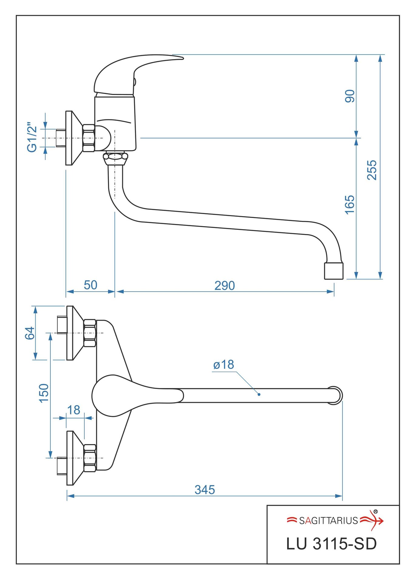 Dřezová stěnová baterie LUNA s ramínkem „SD“ (ramínko 300mm) – rozteč 150 mm