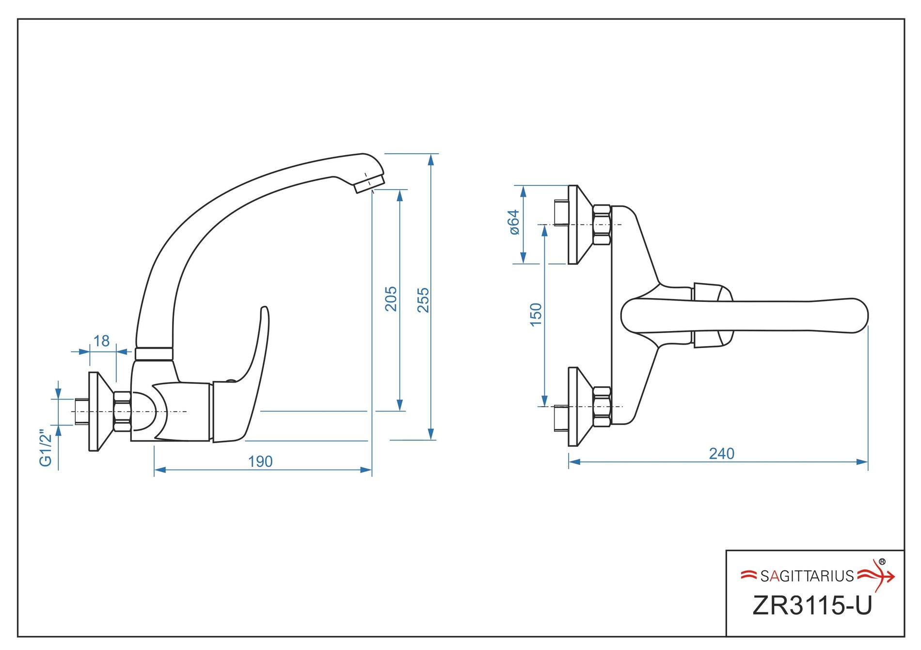 Dřezová stěnová baterie s přední ovládací pákou a horním ramínkem, rozteč 150 mm, chrom – ZORA