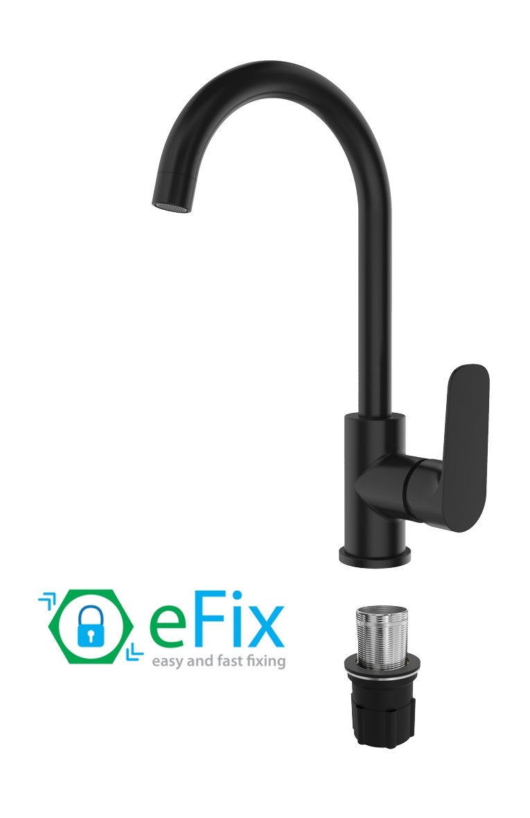 Dřezové vodovodní baterie zastávají dominantní postavení v každé kuchyni. Umístěné nad dřezem jsou nepostradatelným pomocníkem zejména při mytí nádobí. Rameno dřezové baterie by mělo být delší, abychom jej mohli natočit podle potřeby a tím měnit umístění proudu vytékající vody. Dřezová stojánková baterie designové řady DAKOTA BLACK plně odpovídá těmto požadavkům. Je vybavena pevným vysokým plně otočným ramínkem (360°). Ramínko je ukončeno plastovým perlátorem (snadno vyměnitelným) v kovovém (černém) pouzdře. Stejně jako ostatní pákové baterie má i tato svou nejdůležitější část – kartuši. Na té závisí plynulý chod vodovodní baterie (vypínání zapínání a smíchání teplé a studené vody) a proto velmi záleží na její kvalitě. V této baterii je kartuše osazena kvalitními keramickými destičkami, které zajišťují dlouhou a bezproblémovou životnost. Na kartuši se navíc vztahuje i prodloužená záruka 6 let. Baterie není vybavena mechanickou výpustí (AG). Součástí balení jsou přívodní hadičky (flexi-hadičky). rychloupínací systém eFix umožňuje komfortnější montáž a demontáž zejména v případě hůře přístupných instalací a zajišťuje větší stabilitu stojánkových baterií