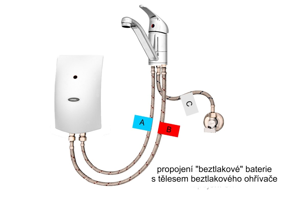 - Nízkotlakové baterie jsou určeny k beztlakovým průtokovým ohřívačům . Jsou speciálně zkonstuovány pro provoz v místech (stejně jako beztlakové ořívače), kde je na přívodu k dispozici jen nízký tlak vody (např. „samospád“ z expanzní nádoby a pod.). Plní i funkci pojišťovacího ventilu (při přetlaku v systému vodu automaticky upouštějí) . Lze je použít i k tlakovým ohřívačům. Ramínko baterie je plně otočné (360°).