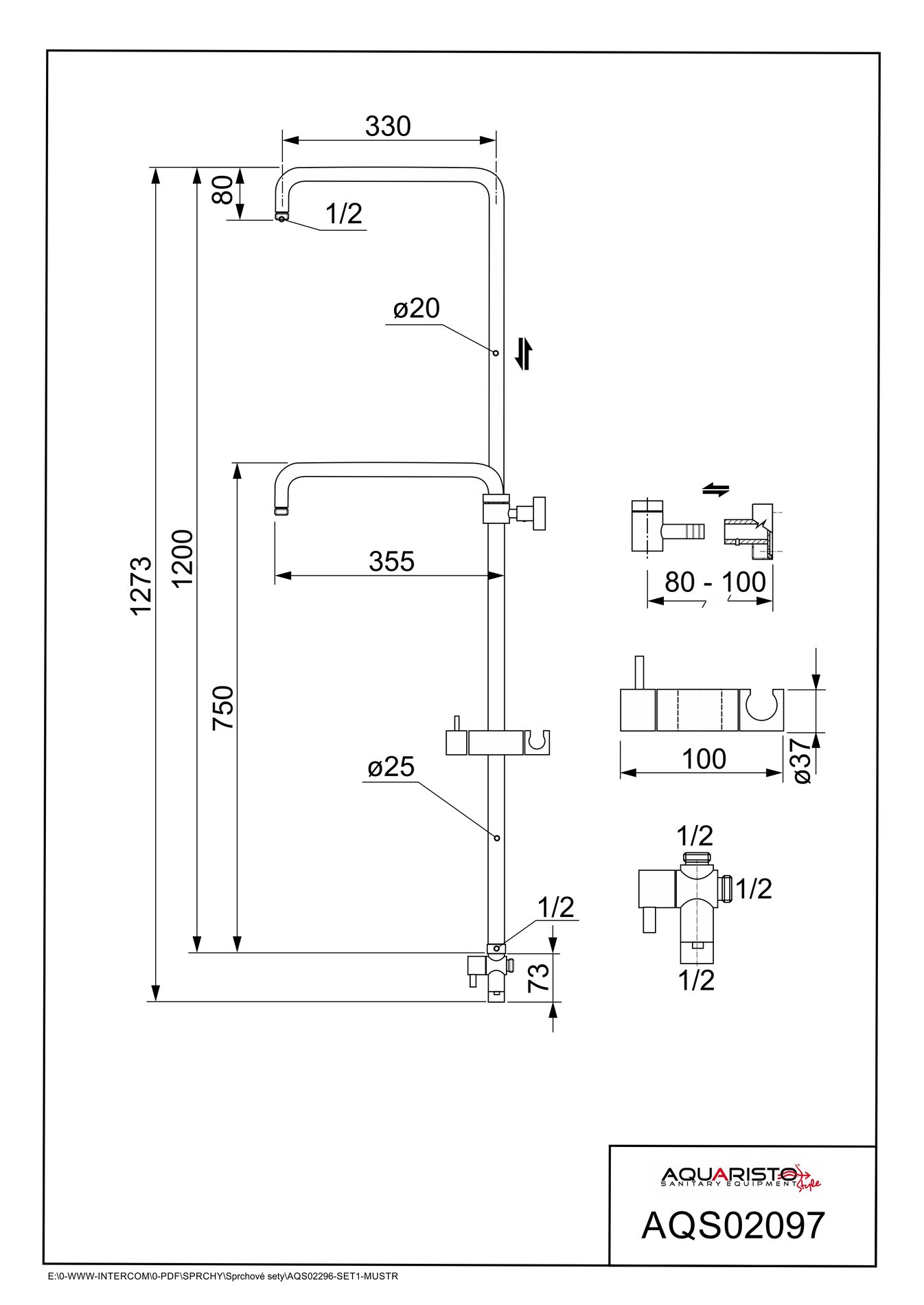 Pevné kovové teleskopické rameno sprchy, délka 750-1200 mm, vyložení 330 mm závit na připojení sprchy 1/2″ převlečná matice k napojení přívodu vody 1/2″ přepínač s vývodem pro napojení ruční sprchy – připojovací závity 1/2″ x 1/2″