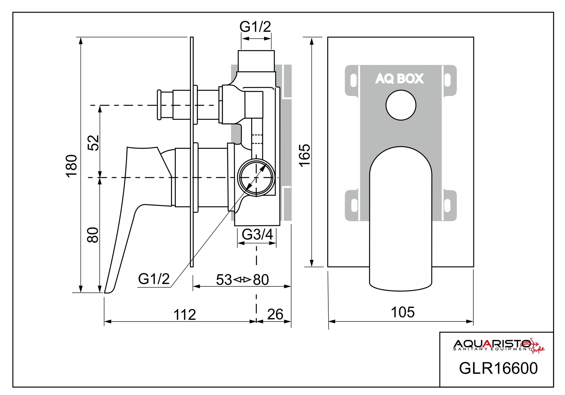 Podomítková část baterie je upevněna v ochranném boxu z odolného plastu (AQ BOX), umožňujícím pohodlnou a bezpečnou montáž AQ BOX se skládá ze dvou dílů: spodní díl slouží k ukotvení baterie ve stěně horní díl je určen k ochraně povrchu baterie před poškozením při montáži a zednických pracích – ve finále se odstraní přepínač sprchy je vybaven vratnou pružinou a nelze jej aretovat, po vypnutí vody se vrátí do výchozí polohy
