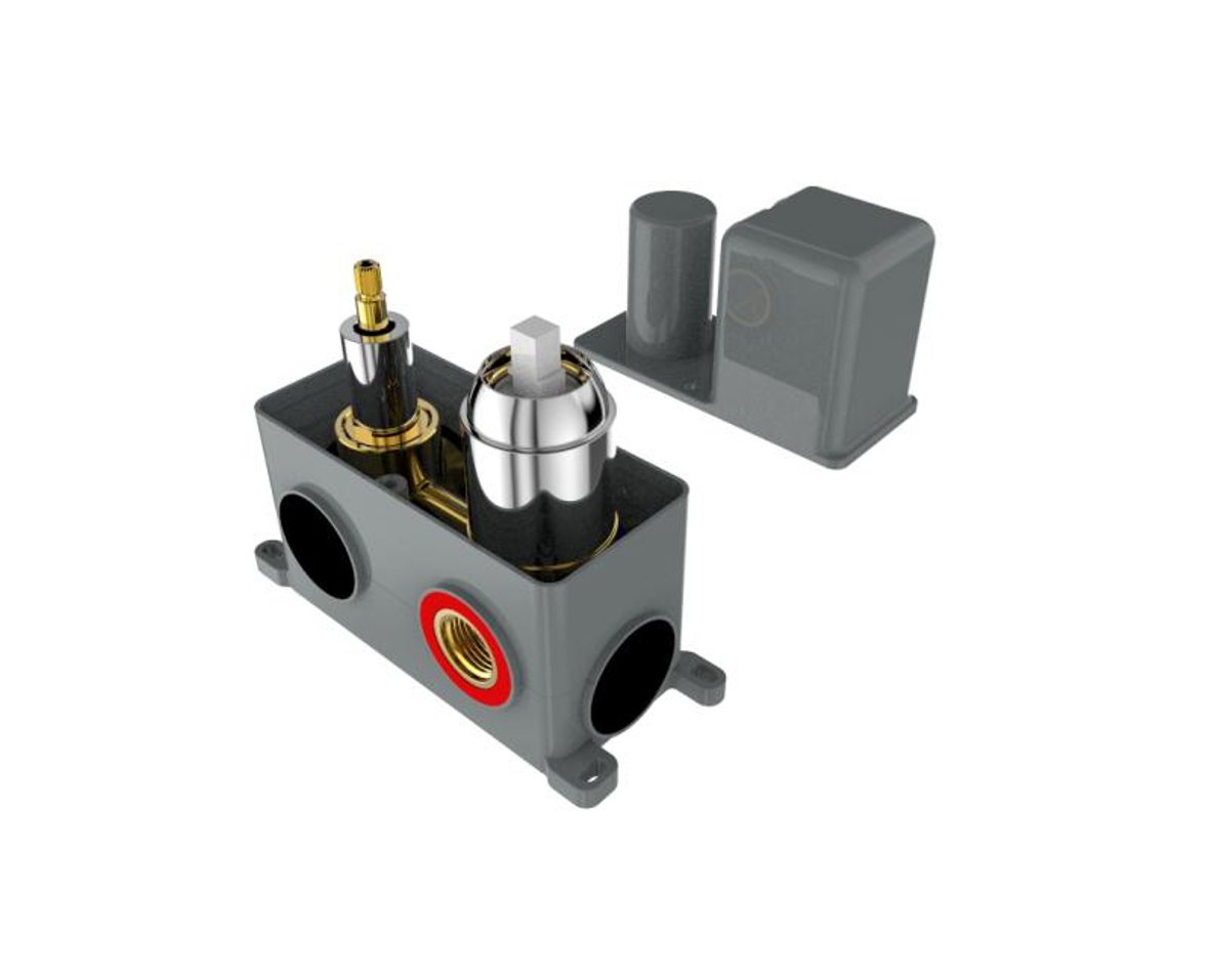 Podomítková část baterie je upevněna v ochranném boxu z odolného plastu (AQ BOX), umožňující pohodlnou a bezpečnou montáž. AQ BOX se skládá ze tří částí: spodní a prostřední díl slouží k ukotvení baterie ve stěně horní díl je určen k ochraně povrchu baterie před poškozením při montáži a zednických pracích – ve finále se odstraní horní kryt AQ BOXu je vybaven krabicovou libelou pro usnadnění usazení boxu při montáži (pomocný montážní prvek) Baterie je osazena spolehlivým dvoupolohovým keramickým přepínačem režimu průtoku (přepínání výtoku z baterie do zvoleného odběrného místa – ruční sprcha, hlavová sprcha, vana apod.). Je ovládán samostatnou páčkou otáčením (krajní polohy jsou naznačeny hroty oboustranné šipky vyleptané do krytu baterie).