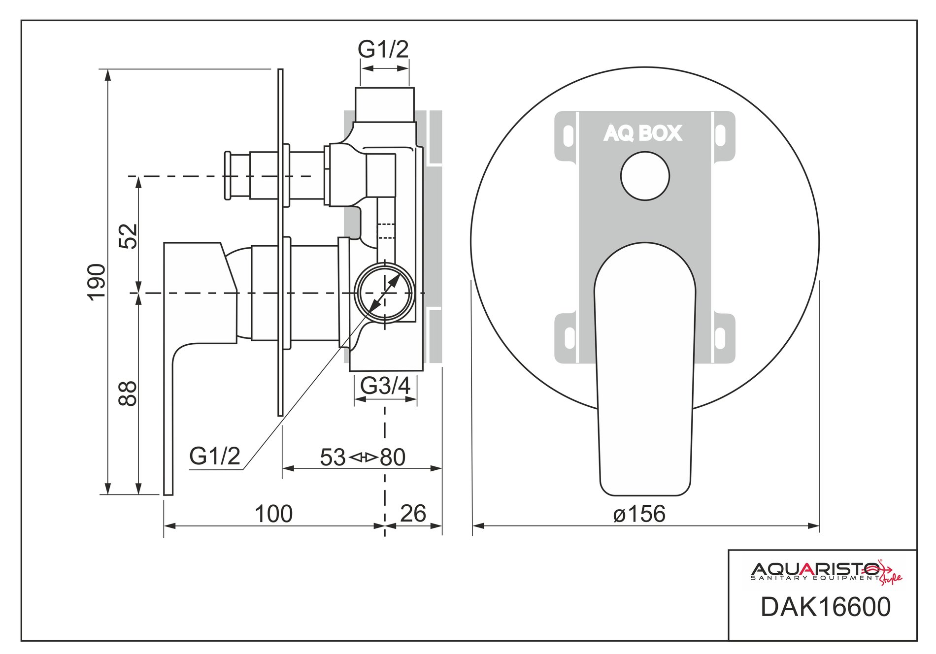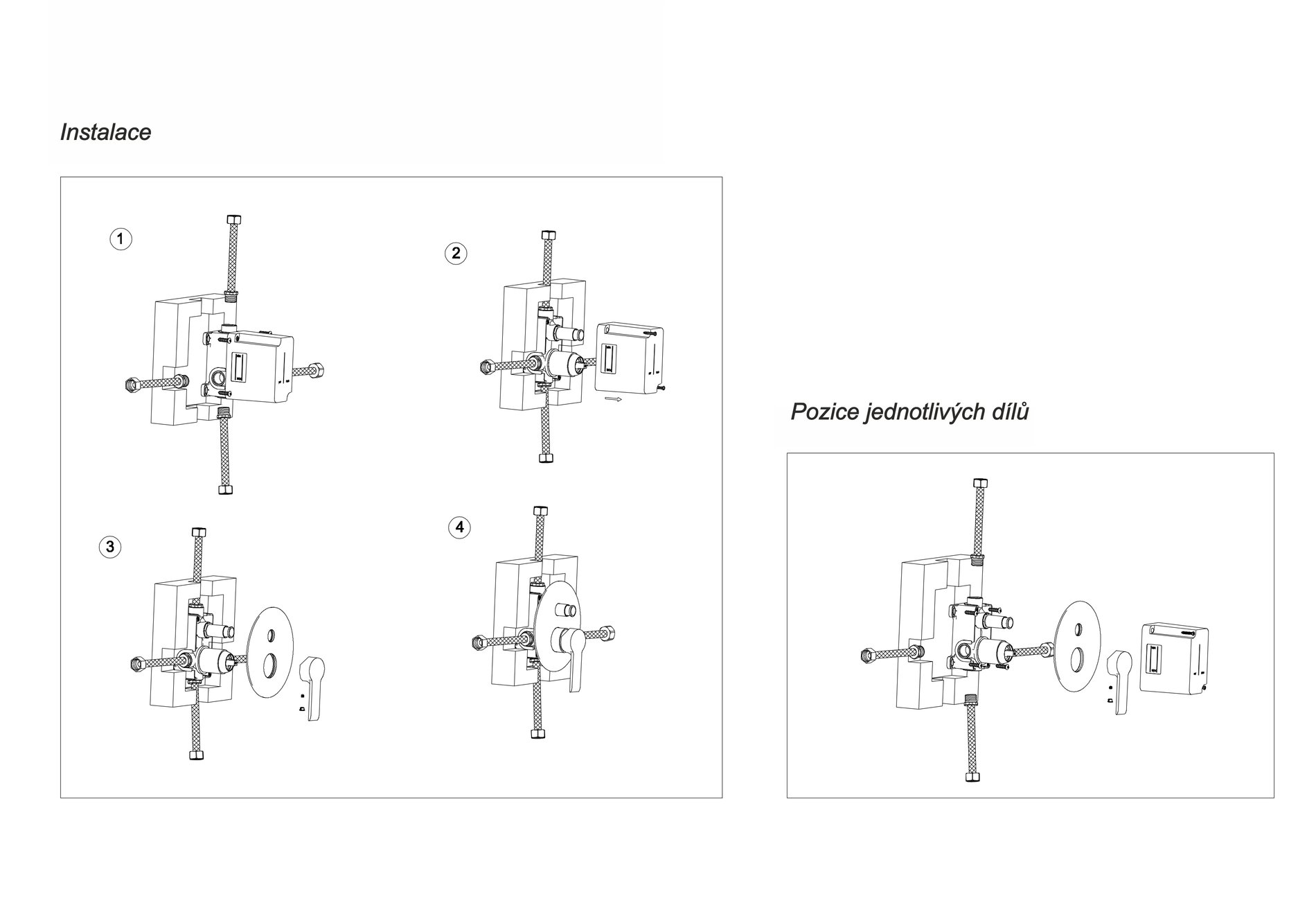 Podomítková část baterie je upevněna v ochranném boxu z odolného plastu (AQ BOX), umožňujícím pohodlnou a bezpečnou montáž AQ BOX se skládá ze dvou dílů: spodní díl slouží k ukotvení baterie ve stěně horní díl je určen k ochraně povrchu baterie před poškozením při montáži a zednických pracích – ve finále se odstraní přepínač sprchy je vybaven vratnou pružinou a nelze jej aretovat, po vypnutí vody se vrátí do výchozí polohy
