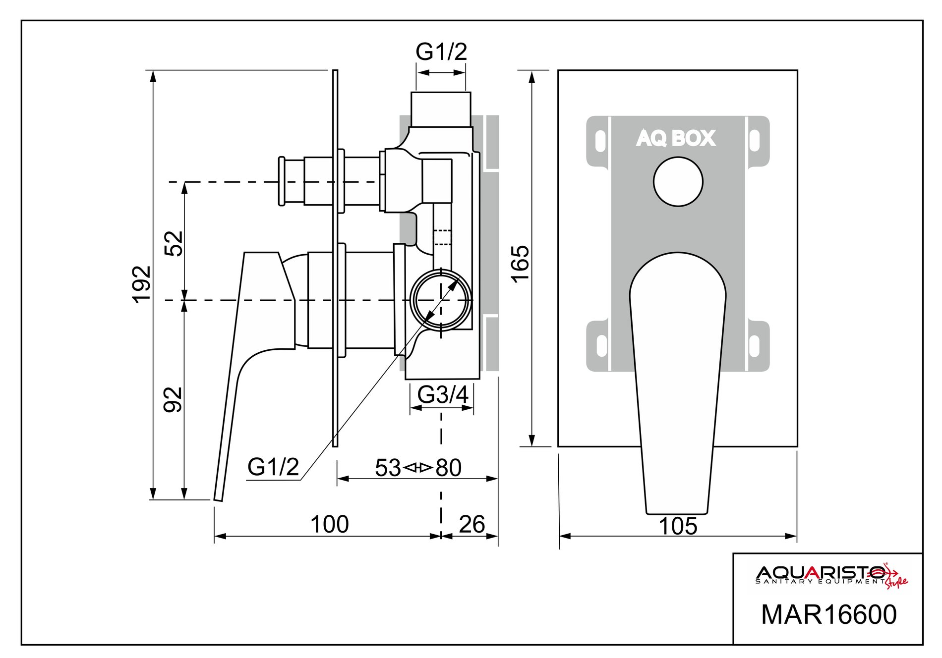 Podomítková část baterie je upevněna v ochranném boxu z odolného plastu (AQ BOX), umožňujícím pohodlnou a bezpečnou montáž AQ BOX se skládá ze dvou dílů: spodní díl slouží k ukotvení baterie ve stěně horní díl je určen k ochraně povrchu baterie před poškozením při montáži a zednických pracích – ve finále se odstraní přepínač sprchy je vybaven vratnou pružinou a nelze jej aretovat, po vypnutí vody se vrátí do výchozí polohy