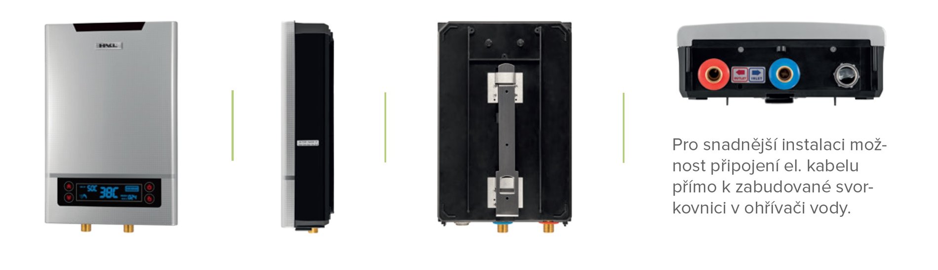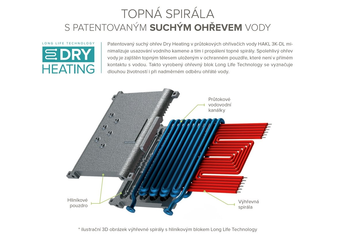 HAKL 3K DL ocení všichni zákazníci, kteří požadují okamžitý a neomezený ohřev teplé vody ve velkém množství bez nutnosti akumulačního (zásobníkového) ohřevu vody. Ohřívač nepřetěžuje elektrickou síť, výkon je rozložený zapojením na třífázový elektrický rozvod (400V). Komfortní způsob užívání ohřívače je dosažen mikroprocesorem, který udržuje konstantní teplotu výstupní ohřáté vody i při měnícím se průtoku. Automatické plynulé zvyšování nebo snižování příkonu topných spirál se uplatní nejen při používání dřezové a sprchové baterie, ale také při zimním a letním režimu. Tato automatická změna výkonu ohřevu dělá z ohřívače výkonný a úsporný model zároveň. Podsvícený dotykový displej s měřením celkové spotřeby elektrické energie a litrů vody jen podtrhují technickou vyspělost tohoto průtokového ohřívače vody. montáž do domácího vodovodního 6. barového systému zapojení na napětí 3 x 230V, trojnásobný výkon ohřevu okamžitý a nepřetržitý ohřev vody od minimálního spínacího tlaku 1,6 bar suchá výhřevná spirála s patentovaným ohřevem vody automatické plynulé zvyšování příkonu výhřevných spirál od 4 do 12 kW mikroprocesorem dosažená konstantní teplota ohřáté vody pri měnícím sa průtoku nastavení výstupní teploty vody v rozsahu od 30 oC do 60 oC celkové měření spotřeby elektrické energie a litrů vody podsvícený dotykový displej tlačítko pro vypnutí ohřevu (standby režim) každá výhřevná spirála se samostatnou restartovací tepelnou pojistku spínač průtoku vody a tlakový nastaviteľný pojistný ventil tepelné čidlo na vstupu i na výstupu vody mikroprocesorem řízená tepelná ochrana elektronická ochrana proti přepálení spirál hydraulická ochrana proti přehřátí ohřevného systému Patentovaný suchý ohřev Dry Heating v průtokových ohřívačích vody HAKL 3K-DL minimalizuje usazování vodního kamene a tím i propálení topné spirály. Spolehlivý ohřev vody je zajištěn topným tělesem uloženým v ochranném pouzdře, které není v přímém kontaktu s vodou. Takto vyrobený ohřevný blok Long Life Technology se vyznačuje dlouhou životností i při nadměrném odběru ohřáté vody.