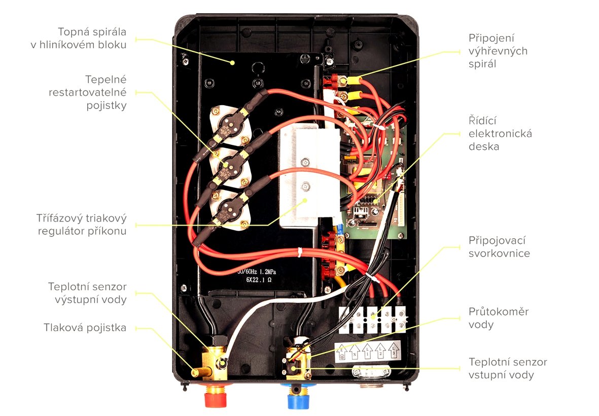 Elektronický průtokový ohřívač vody s hydraulickým spínáním a tlakovým provozem.