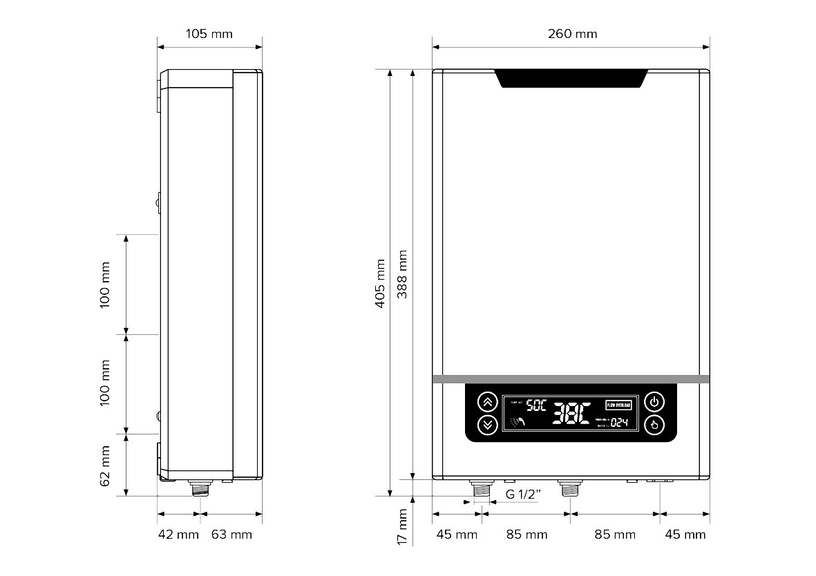 HAKL 3K DL ocení všichni zákazníci, kteří požadují okamžitý a neomezený ohřev teplé vody ve velkém množství bez nutnosti akumulačního (zásobníkového) ohřevu vody. Ohřívač nepřetěžuje elektrickou síť, výkon je rozložený zapojením na třífázový elektrický rozvod (400V). Komfortní způsob užívání ohřívače je dosažen mikroprocesorem, který udržuje konstantní teplotu výstupní ohřáté vody i při měnícím se průtoku. Automatické plynulé zvyšování nebo snižování příkonu topných spirál se uplatní nejen při používání dřezové a sprchové baterie, ale také při zimním a letním režimu. Tato automatická změna výkonu ohřevu dělá z ohřívače výkonný a úsporný model zároveň. Podsvícený dotykový displej s měřením celkové spotřeby elektrické energie a litrů vody jen podtrhují technickou vyspělost tohoto průtokového ohřívače vody. montáž do domácího vodovodního 6. barového systému zapojení na napětí 3 x 230V, trojnásobný výkon ohřevu okamžitý a nepřetržitý ohřev vody od minimálního spínacího tlaku 2 bar suchá výhřevná spirála s patentovaným ohřevem vody automatické plynulé zvyšování příkonu výhřevných spirál od 5 do 15 kW mikroprocesorem dosažená konstantní teplota ohřáté vody pri měnícím sa průtoku nastavení výstupní teploty vody v rozsahu od 30 oC do 60 oC celkové měření spotřeby elektrické energie a litrů vody podsvícený dotykový displej tlačítko pro vypnutí ohřevu (standby režim) každá výhřevná spirála se samostatnou restartovací tepelnou pojistku spínač průtoku vody a tlakový nastaviteľný pojistný ventil tepelné čidlo na vstupu i na výstupu vody mikroprocesorem řízená tepelná ochrana elektronická ochrana proti přepálení spirál hydraulická ochrana proti přehřátí ohřevného systému Patentovaný suchý ohřev Dry Heating v průtokových ohřívačích vody HAKL 3K-DL minimalizuje usazování vodního kamene a tím i propálení topné spirály. Spolehlivý ohřev vody je zajištěn topným tělesem uloženým v ochranném pouzdře, které není v přímém kontaktu s vodou. Takto vyrobený ohřevný blok Long Life Technology se vyznačuje dlouhou životností i při nadměrném odběru ohřáté vody.