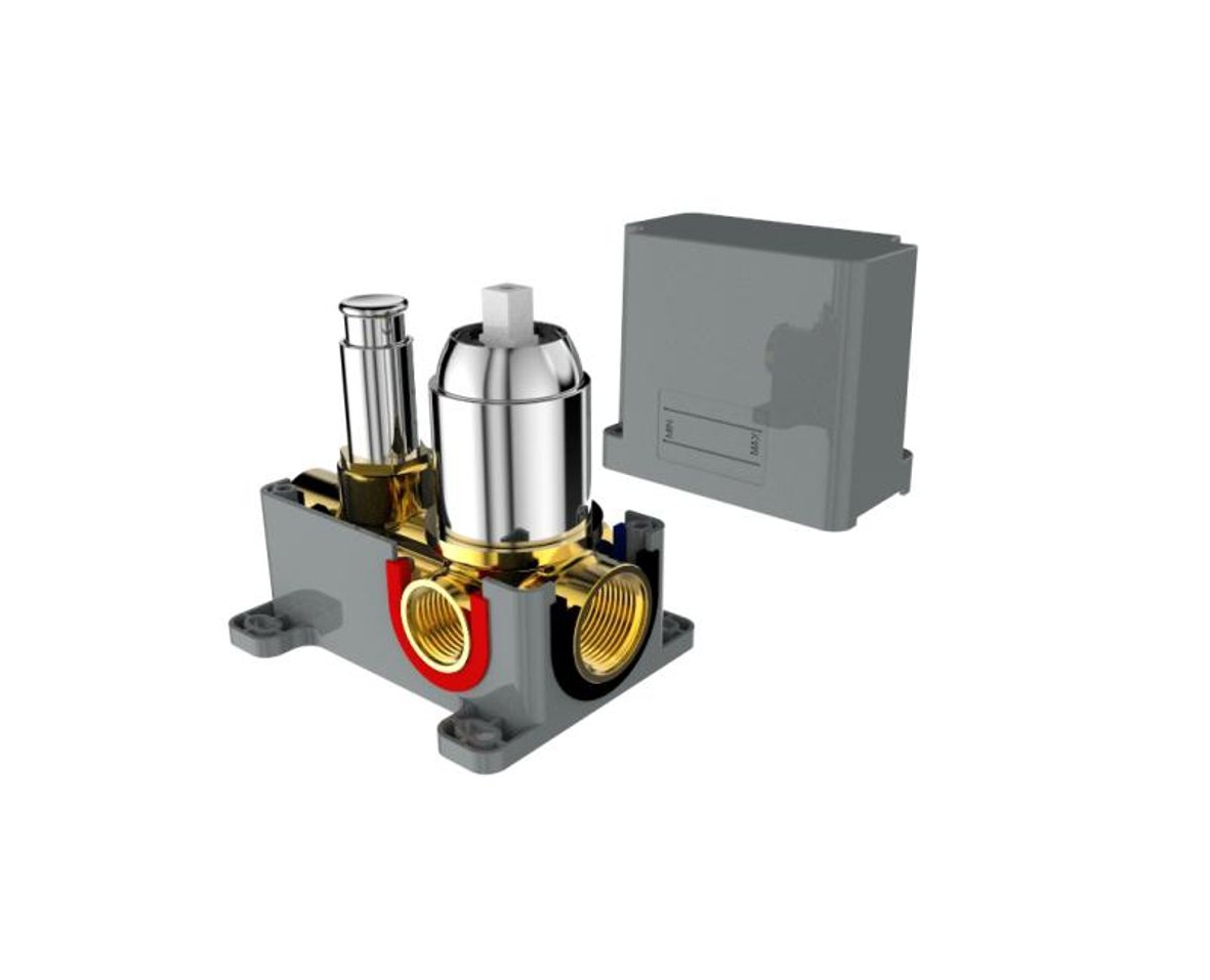 Podomítková část baterie je upevněna v ochranném boxu z odolného plastu (AQ BOX), umožňujícím pohodlnou a bezpečnou montáž AQ BOX se skládá ze dvou dílů: spodní díl slouží k ukotvení baterie ve stěně horní díl je určen k ochraně povrchu baterie před poškozením při montáži a zednických pracích – ve finále se odstraní přepínač sprchy je vybaven vratnou pružinou a nelze jej aretovat, po vypnutí vody se vrátí do výchozí polohy