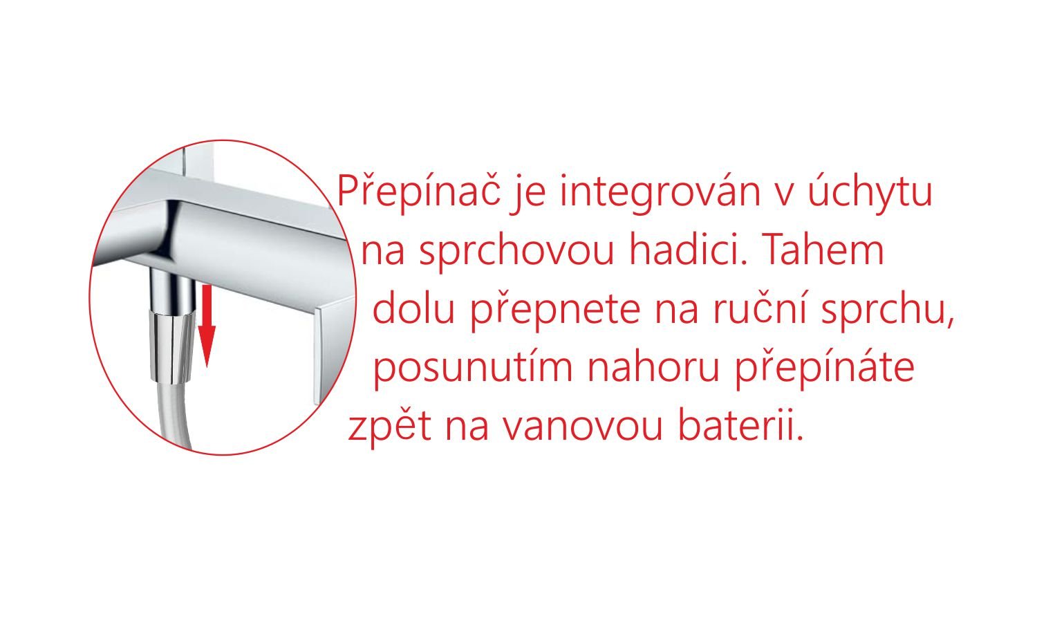 Součástí vanové baterie není sprchová sada (ruční sprcha a sprchová hadice) baterie má přepínání režimu vana/sprcha zabudováno v místě připojení hadice. Tahem dolů se přepne proud vody do sprchy. Přepínač je vybaven vratnou pružinou, takže se po vypnutí vody vrátí do původní polohy napojení na sprchovou hadici (1/2″) je vybaveno zpětnou klapkou zabraňující nasátí vody zpět do vodovodního systému povrch ovládací páčky má protiskluzovou úpravu (kosoúhlé vroubkování)