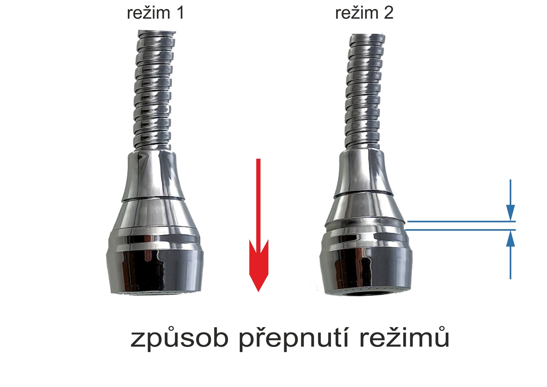 – spořič vody má dva průtokové režimy (viz záložka Technické parametry) ovladatelné posunutím chromové objímky směrem nahoru/dolů – je přizpůsobivý většině typů vodovodních baterií – součástí dodávky je plastová redukce, vnitřní závit M24x1/vnější M22x1 + těsnění