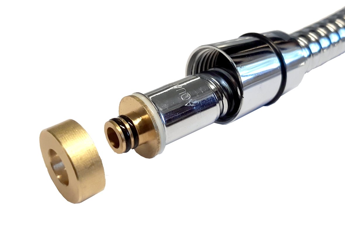 Sprchová hadice dvouzámková (oplet z pochromované nerezové oceli) s kovovými převlečnými maticemi. Hadice se montuje mezi vodovodní baterii a sprchovu hlavici (sprchu). Kovový oplet kryjící pryžové jádro hadice značně zvyšuje její užitnou hodnotu a odolnost. hadice je v kónusové koncovce vybavena systémem zabraňujícím jejímu překroucení ANTI TWIST (viz níže). je osazena jednou maticí s protiskluzovou úpravou a druhou ve tvaru kónusu součástí dodávky jsou dva kusy gumového těsnění (1/2″) do připojovacích matic Druhy připojovacích matic používaných ke sprchovým hadicím: Připojovací matice základního typu má protiskluzovou úpravu (rýhování). Podle provedení jsou hadice osazeny buď jednou touto maticí (slouží k napojení na zdroj vody) a jako druhá matice pro připojení sprchy je určena prodloužená matice ve tvaru kónusu (je doplněna venkovní těsnící gumičkou kvůli stabilnější pozici v držáku sprchy). Jiná provedení jsou dodávána s „kónusovými“ maticemi na obou koncích, případně s oběma maticemi v protiskluzovém provedení. Vybrané modely sprchových hadic k bateriím jsou navíc opatřeny systémem zabraňujícím jejich překroucení. ANTI TWIST- zabraňuje smotání sprchové hadice při sprchování. Je zabudován v koncovce sprchové hadice (převlečné matici). Při jakékoli pozici hadice, kdy by hrozilo její smotání se v koncovce vybavené systémem ANTI TWIST hadice spolehlivě protočí a srovná.