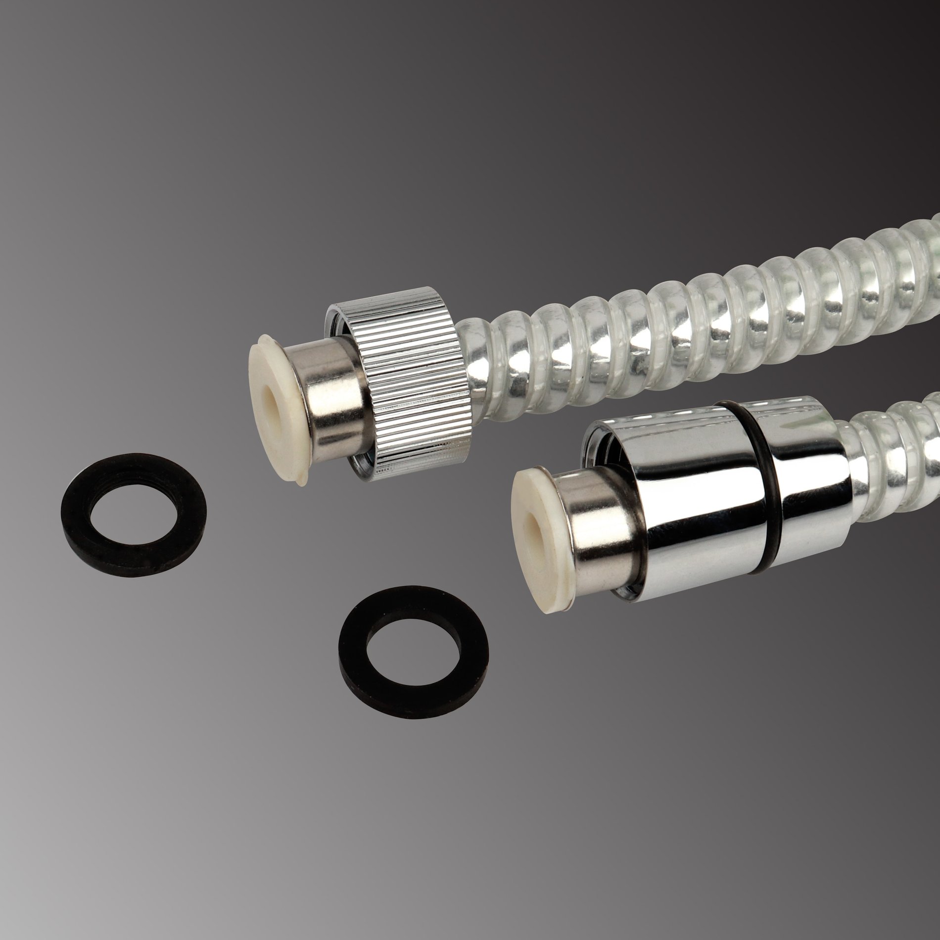 Bílá plastová sprchová hadice s chromovým designovým páskem a kovovými převlečnými maticemi. Hadice se montuje mezi vodovodní baterii a sprchovu hlavici (sprchu). Výhodou plastové hadice je mimo jiné i skutečnost, že zabraňuje případnému poškrábání vany. hadice je v kónusové koncovce vybavena systémem zabraňujícím jejímu překroucení ANTI TWIST (viz níže). je osazena jednou maticí s protiskluzovou úpravou a druhou ve tvaru kónusu součástí dodávky jsou dva kusy gumového těsnění (1/2″) do připojovacích matic Druhy připojovacích matic používaných ke sprchovým hadicím: Připojovací matice základního typu má protiskluzovou úpravu (rýhování). Podle provedení jsou hadice osazeny buď jednou touto maticí (slouží k napojení na zdroj vody) a jako druhá matice pro připojení sprchy je určena prodloužená matice ve tvaru kónusu (je doplněna venkovní těsnící gumičkou kvůli stabilnější pozici v držáku sprchy). Jiná provedení jsou dodávána s „kónusovými“ maticemi na obou koncích, případně s oběma maticemi v protiskluzovém provedení. Vybrané modely sprchových hadic k bateriím jsou navíc opatřeny systémem zabraňujícím jejich překroucení. ANTI TWIST- zabraňuje smotání sprchové hadice při sprchování. Je zabudován v koncovce sprchové hadice (převlečné matici). Při jakékoli pozici hadice, kdy by hrozilo její smotání se v koncovce vybavené systémem ANTI TWIST hadice spolehlivě protočí a srovná.