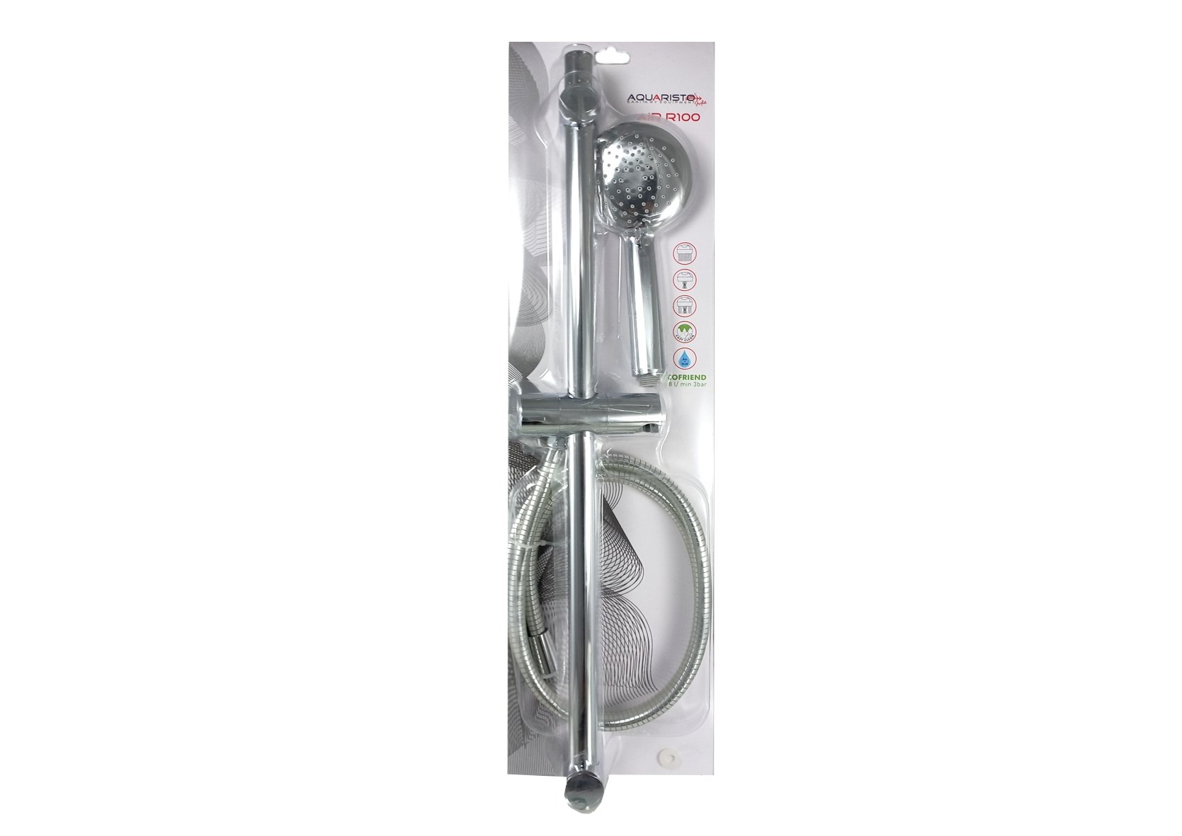 AIR R100, sprchová souprava- 3-polohová plastová sprcha s úsporným režimem (přisávání vzduchu) – luxusní plastová sprchová hadice 150 cm – průměr kovové sprchové tyče – 25 mm – aktivní délka sprchové tyče – 600 mm – celková délka sprchové tyče – 650 mm – baleno v závěsném blistru (nahrazuje AC800228)Soubory ke staženíNávodRozměrový výkres Podrobný popis