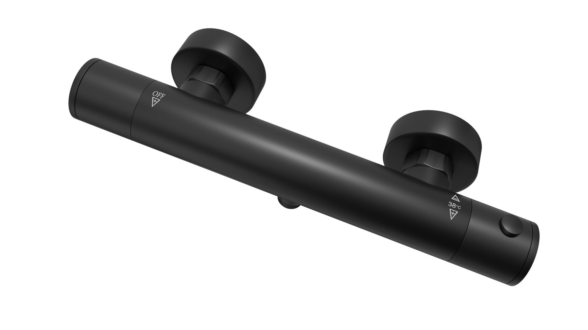 BLAZAR BLACK, sprchová termostatická baterie, dolní vývod, bez sprchové sady, rozteč 150mmBaterie je dodávána bez sprchové sady (sprchová sada = ruční sprcha, sprchová hadice a držák sprchy) – baterie má spodní vývod – toto provedení je vhodné pro připojení ruční sprchy. Baterie je vybavena technologií COOL TOUCH, zabraňující popálení o vnější plášť baterie, zejména v místě přívodu horké vody. Teplota… Podrobný popis
