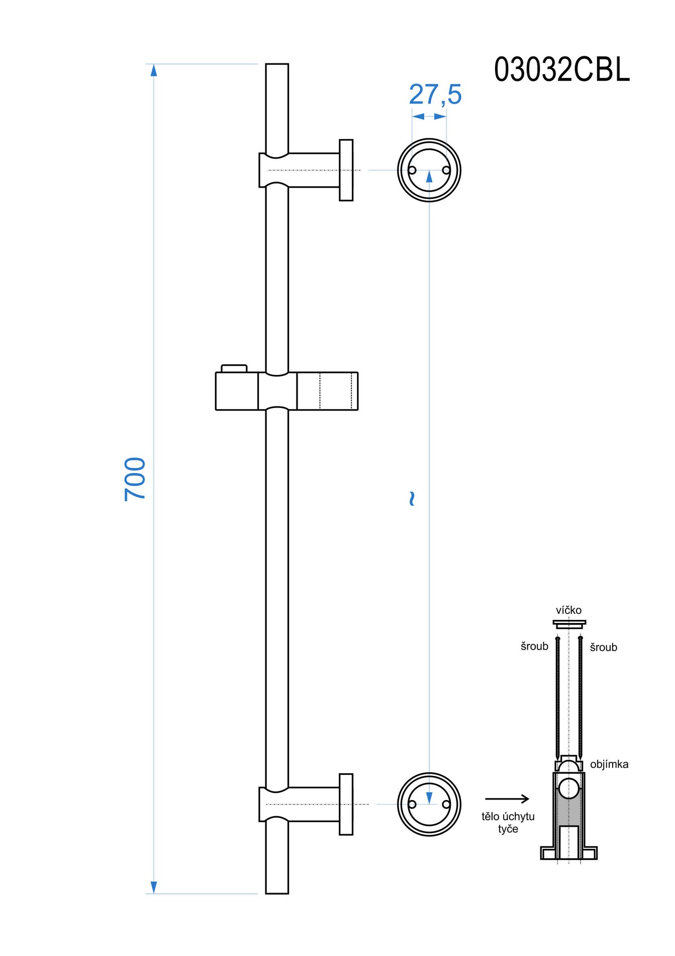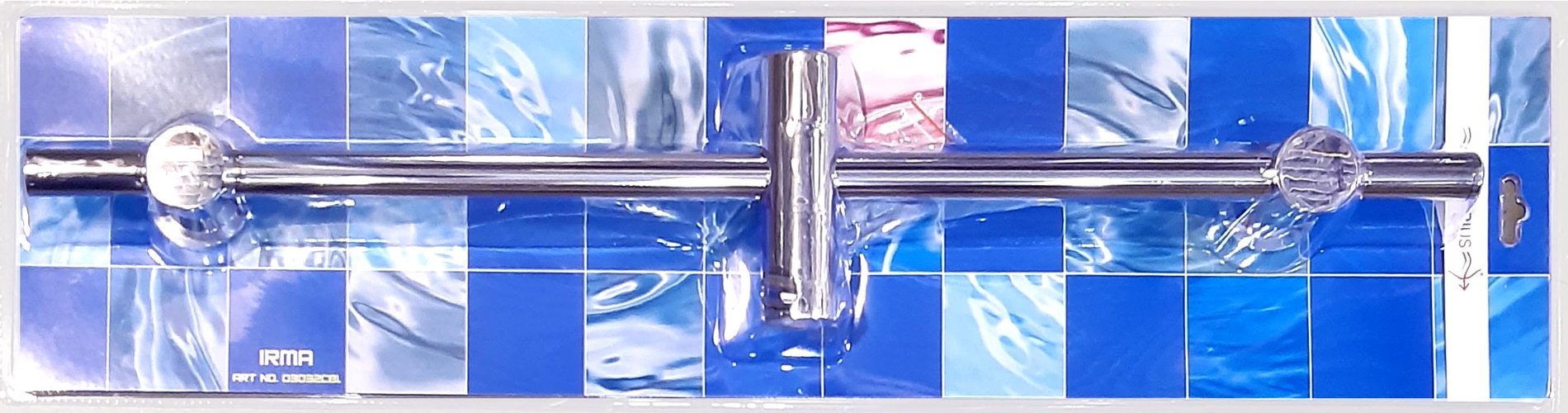 Sprchová tyč IRMA s nastavitelnou roztečí uchycení na stěnu – oba úchyty na zeď, jsou nastavitelné (pojízdné) po celé délce tyče – každý úchyt má dva šrouby situované vodorovně (viz rozměrový výkres) – baleno v závěsném blistru Podrobný popis