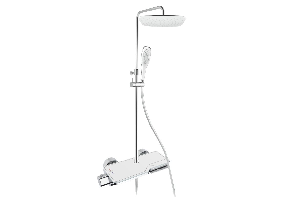 Set CETUS značky Aquaristo Style se skládá z těchto komponentů: termostatická sprchová baterie CETUS, určená pro 2 odběrná místa s horním vývodem pro připojení sprchové tyče a s dolním vývodem pro připojení sprchové hadice se sprškou. součástí baterie je polička z bílého kaleného skla, vhodná k ukládání šampónů a jiné kosmetiky baterie je opatřena technologií zabraňující popálení: eCold touch technology přepínač režimů – ruční sprcha / hlavová sprcha – pomocí dvou designových kláves rychlá odezva při změně teploty anebo tlaku vstupní vody stabilní udržování požadované teploty vody na výstupu v případě přerušení dodávky studené vody se automaticky zablokuje voda na výstupu tepelná pojistka je nastavena na max. teplotu 38°C. povrchová úprava: chrom – bílé sklo.