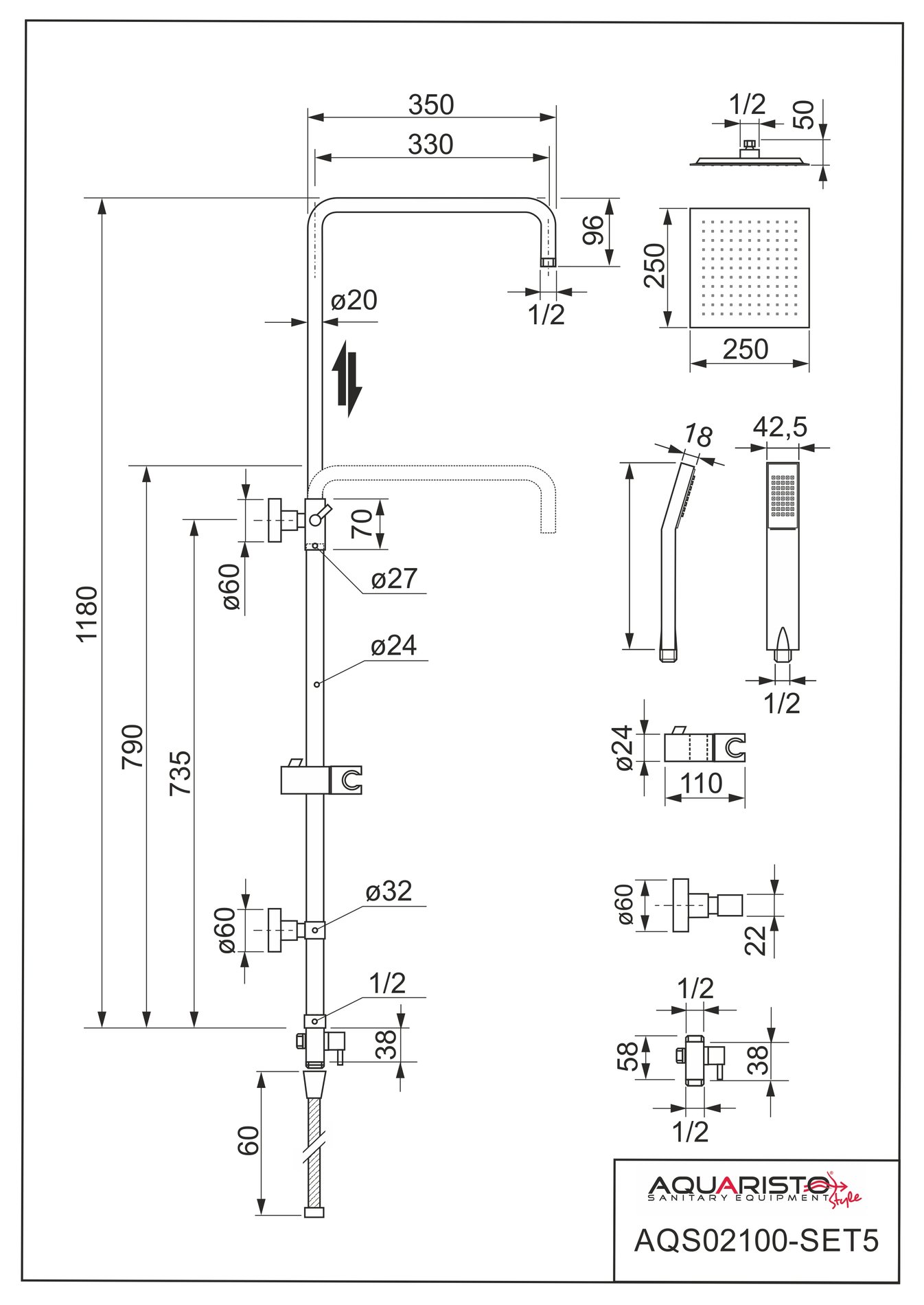 Teleskopické nerezové rameno sprchy IPPARI s nastavitelnou výškou 790 – 1180 mm keramický prepínač režimu mezi ruční a hlavovou sprchou (připojení tyč-přepínač 1/2″ – připojení na zdroj vody 1/2″) plastová sprchová hlavice RALF – 250 x 250 mm. ruční plastová sprška MIRA – 42,5 x 230 mm spodní úchyt tyče ke stěně (IPPARI) posuvný držák ruční spršky připojovací hadice s otočnou koncovkou (ANTI-TWIST) – 600 mm sprchová hadice nerezová, dvojzámková s otočnou koncovkou (ANTI-TWIST) – délka 1500 mm
