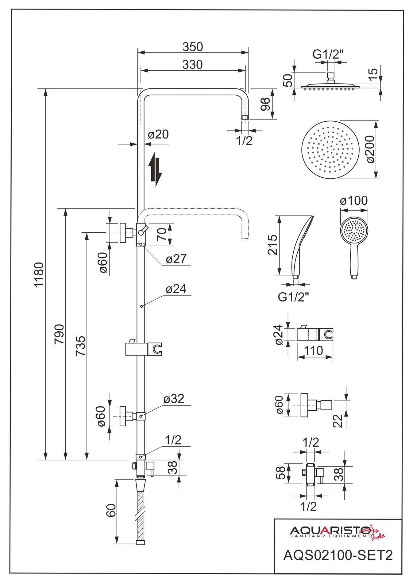 Teleskopické nerezové rameno sprchy IPPARI s nastavitelnou výškou 790 – 1180 mm keramický prepínač režimu mezi ruční a hlavovou sprchou (připojení tyč-přepínač 1/2″ – připojení na zdroj vody 1/2″) plastová sprchová hlavice THIN – ø 200 mm. ruční plastová sprška EVVE – 100 x 225 mm spodní úchyt tyče ke stěně (IPPARI) posuvný držák ruční spršky připojovací hadice s otočnou koncovkou (ANTI-TWIST) – 600 mm sprchová hadice nerezová, dvojzámková s otočnou koncovkou (ANTI-TWIST) – délka 1500 mm