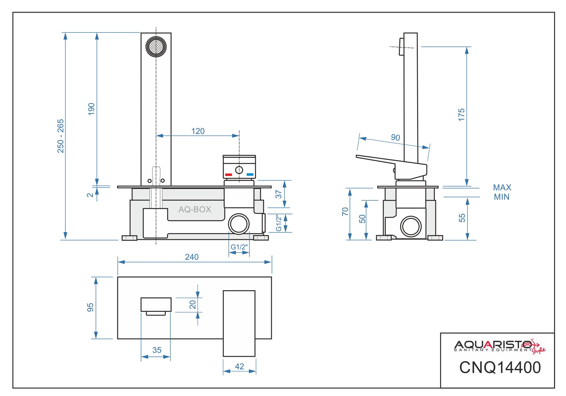 Baterie je usazena v AQ BOXu AQ BOX: zajišťuje ochranu chromovaných částí před poškozením při montáži je vybaven krabicovou libelou k usnadnění montáže usnadňuje kontrolu a přístup k tělu baterie zapuštěné do stěny na střední části boxu je vyznačena minimální a maximální „hlouba“ do které lze box zapustit (rozsah 2 cm) Mosazný čep výtoku je třeba při montáži utěsnit těsnící nití a nastavit (šroubováním) do takové výšky, aby přes krycí desku přesahovala celá tenká část čepu, na kterou bude uchyceno ramínko pomocí dvou aretačních šroubků / červíků. Záruka na kartuši je 6 let.