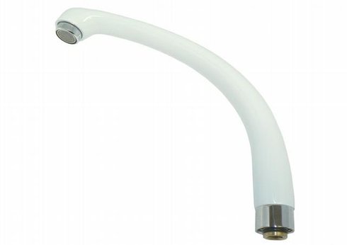 Kulaté výtokové ramínko ke stojánkové dřezové vodovodní baterii typové řady PERLA v provedení bílá, osazené kovovým perlátorem.