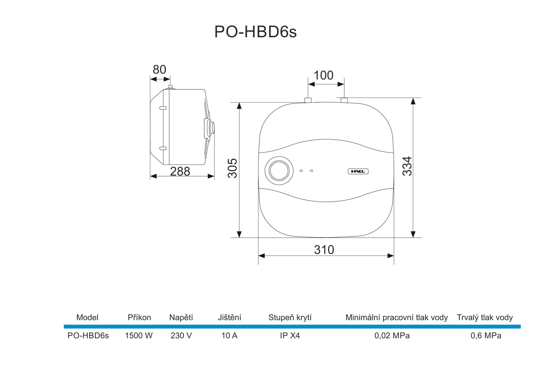 Zásobníkový tlakový ohřívač vody, objem 6 litrů, příkon 1,5 kW, spodní